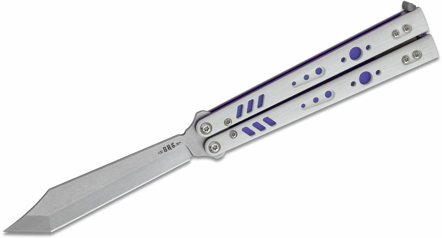 The Replicant by Bladerunners Systems is a sleek performer with G10 handles and one of the coolest blade shapes we’ve seen on a butterfly knife. Designed by and for flippers, the BRS Replicant prides itself on breaking the accepted design cues of previous knives while fixating on weight, balance, comfort and tactility. It is built from the ground up with performance at the forefront of design. Dimensions are centered around optimal manipulation. It features Bladerunners Systems’ Signature Chevron System for immediate and constant haptic feedback and grip. It is optimally balanced for a variation of flipping styles and is superbly built for hard daily use. There isn’t a flex to be found in the handle and the smooth action yields excellent manipulation. The clip point tanto blade shape will impress anyone who sees it and the subtly milled G10 handle scales make for one comfortable flipping butterfly knife. This Premium Replicant features more robust hardware in the form of a 0.187″ pivot with T10 torx screws and 0.25″ stainless steel bushings, sex bolt spacers and improved overall tolerances. The result is without a doubt one of the finest and smoothest butterfly knives on the market. The beautifully purple anodized liners and pocket clip perfectly accent the white G10 handle scales for a knife that you are bound to love. We are fortunate to be a dealer for Bladerunners Systems and bring this amazing product to you.
