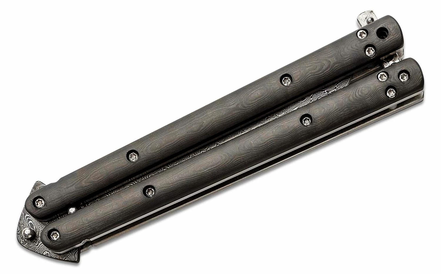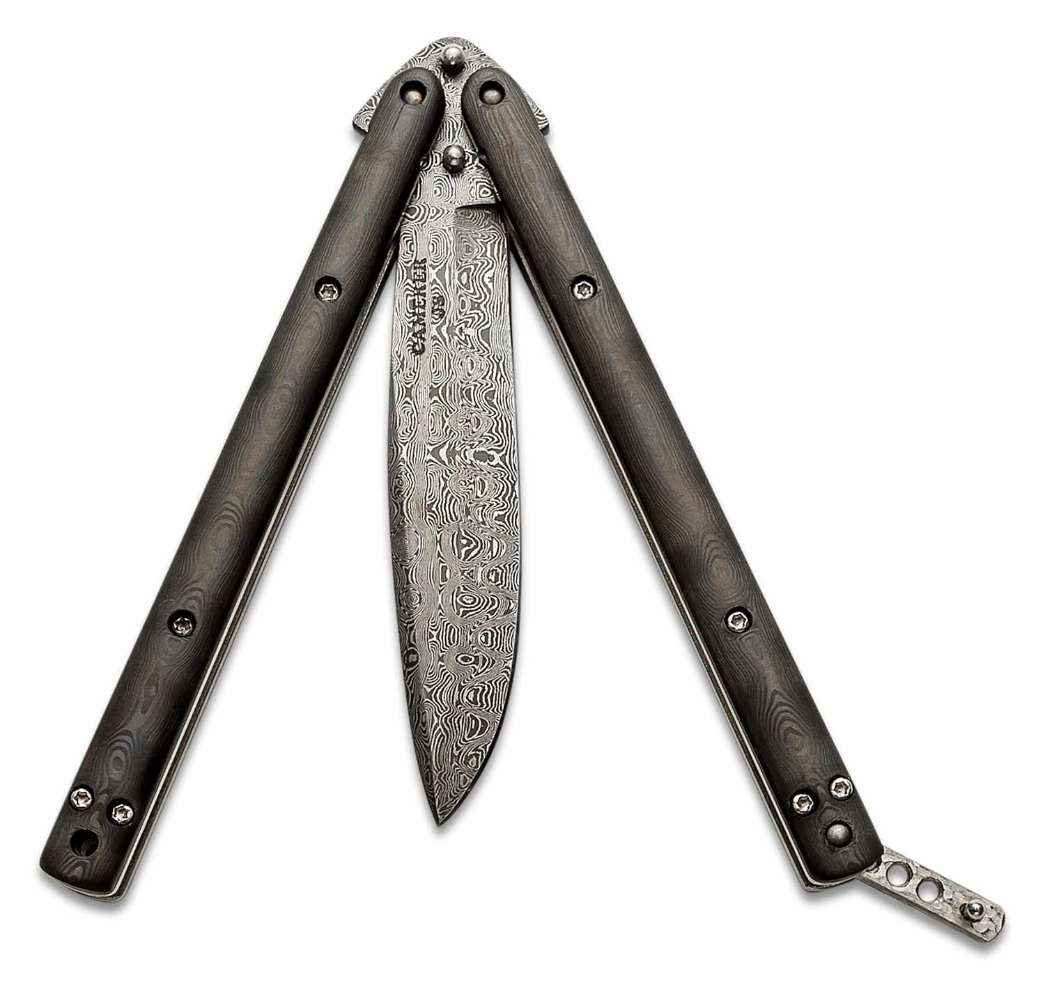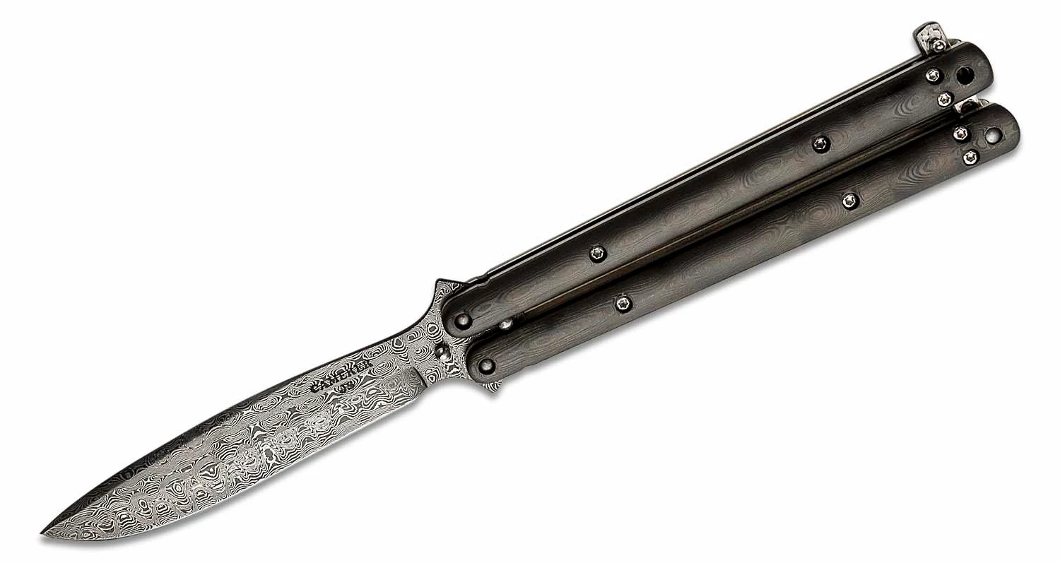 CRCBALIOLBDFC Custom Damascus Drop Point Overlay Balisong – Black Dunes