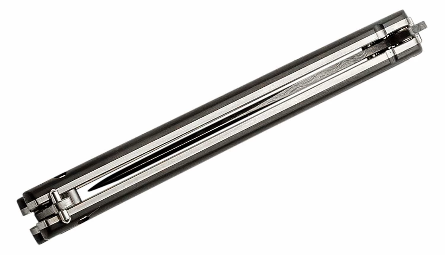 This model features a 1080/15N20 Loki’s Ladder Damascus drop point blade forged by Craig himself with a dark acid-etched finish. The thick, robust handles are made from titanium overlaid with Black Dunes FatCarbon that is nicely contoured for comfort. The knife is fully adjustable with Torx screws and the safety latch can be switched for left or right-hand flipping. This is a fantastic, one-of-a-kind knife so don’t hesitate as it won’t be around for long.