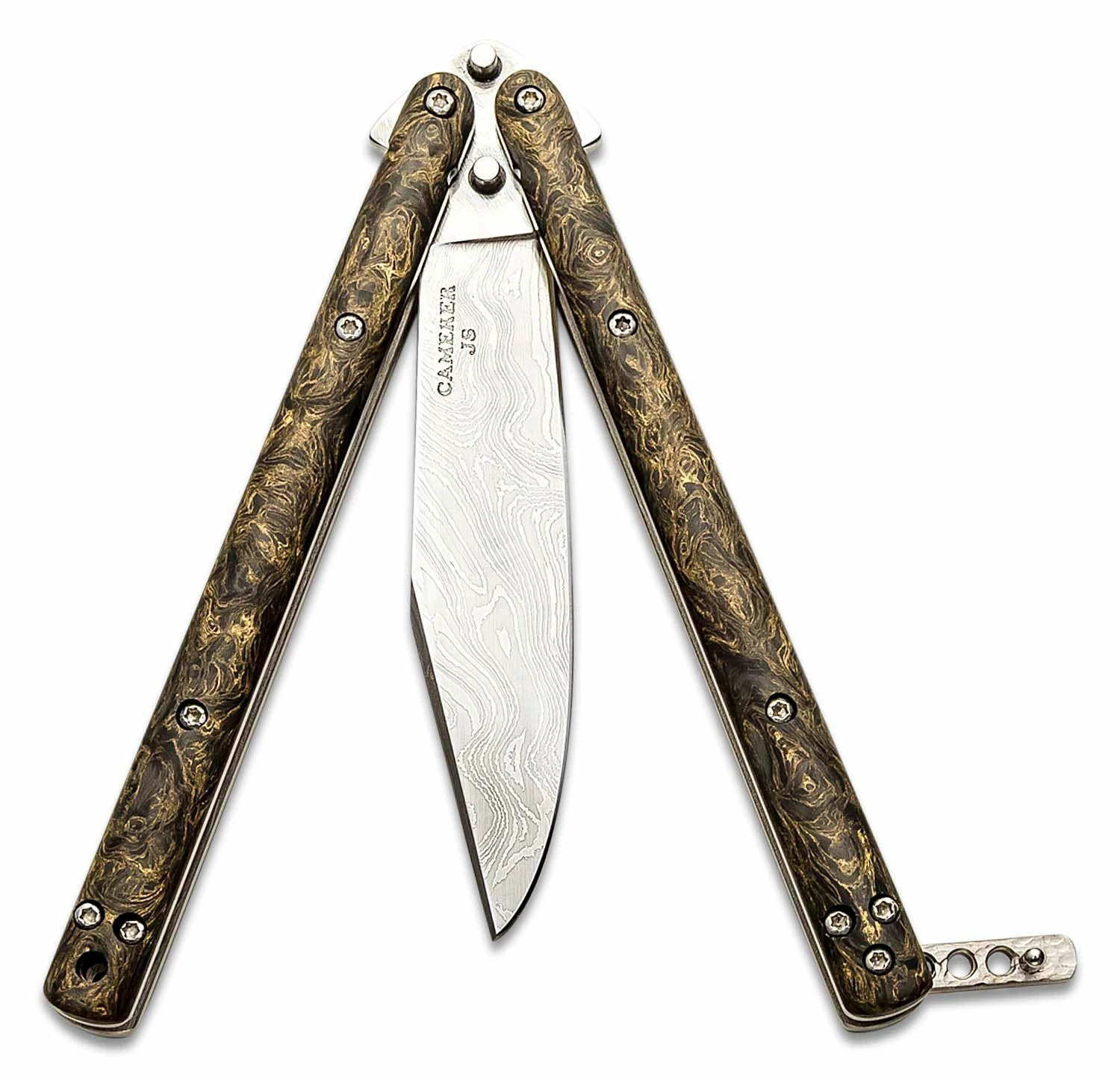 CRCBALIOLDMG Custom Damascus Bowie Overlay Balisong – Dark Matter Gold