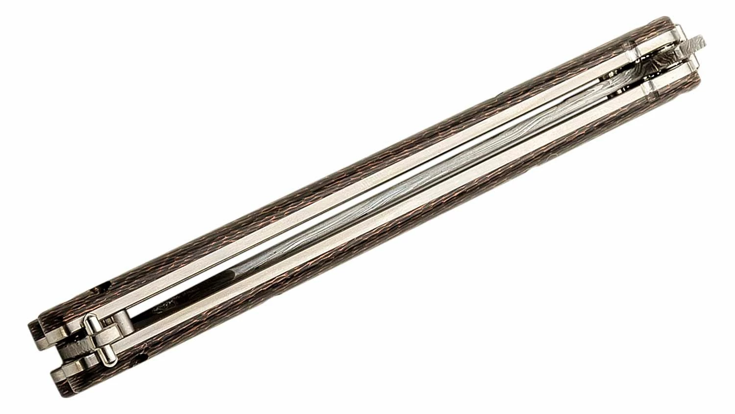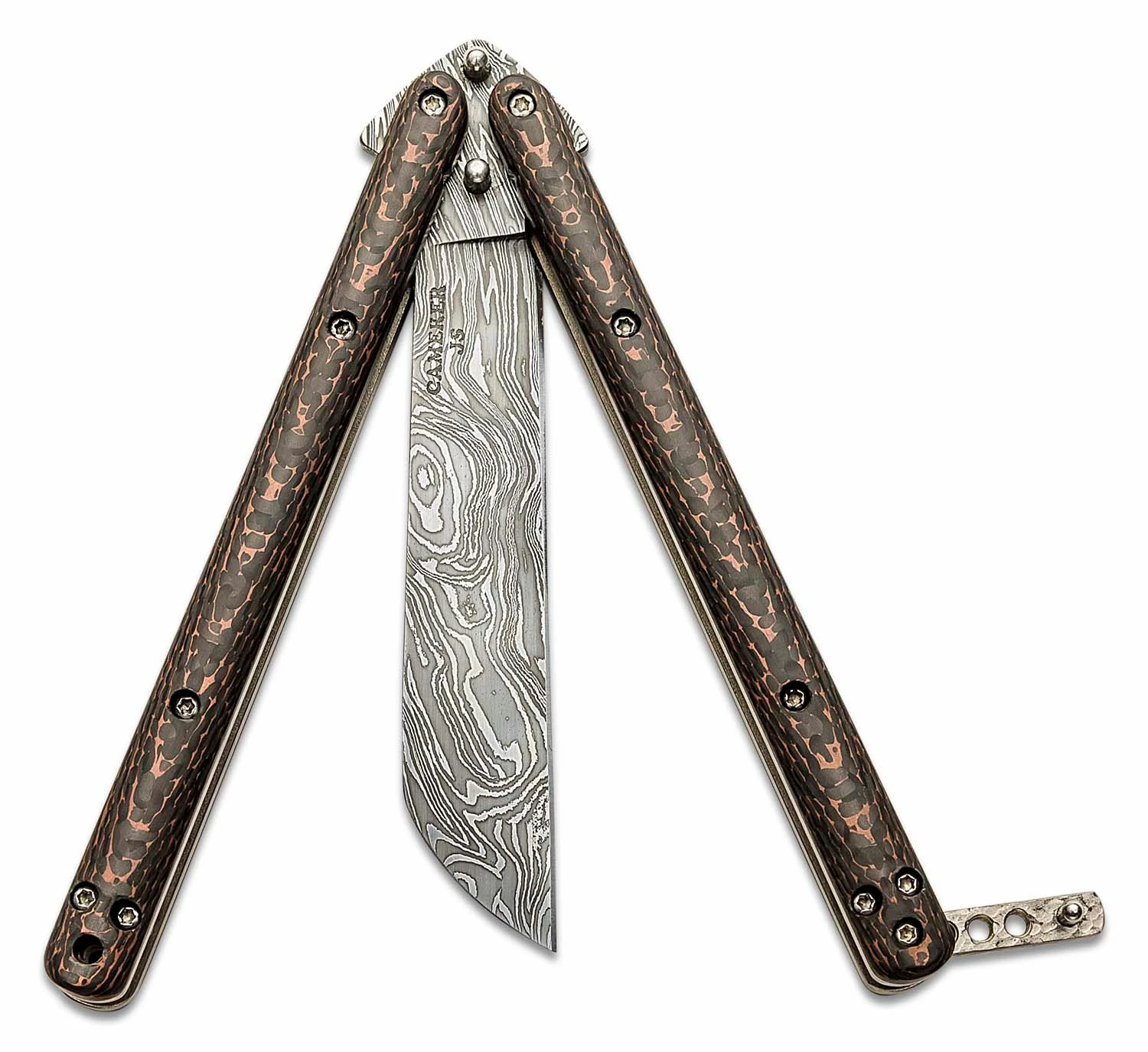CRCBALIOLCSS Custom Damascus Wharncliffe Overlay Balisong – Copper Snakeskin