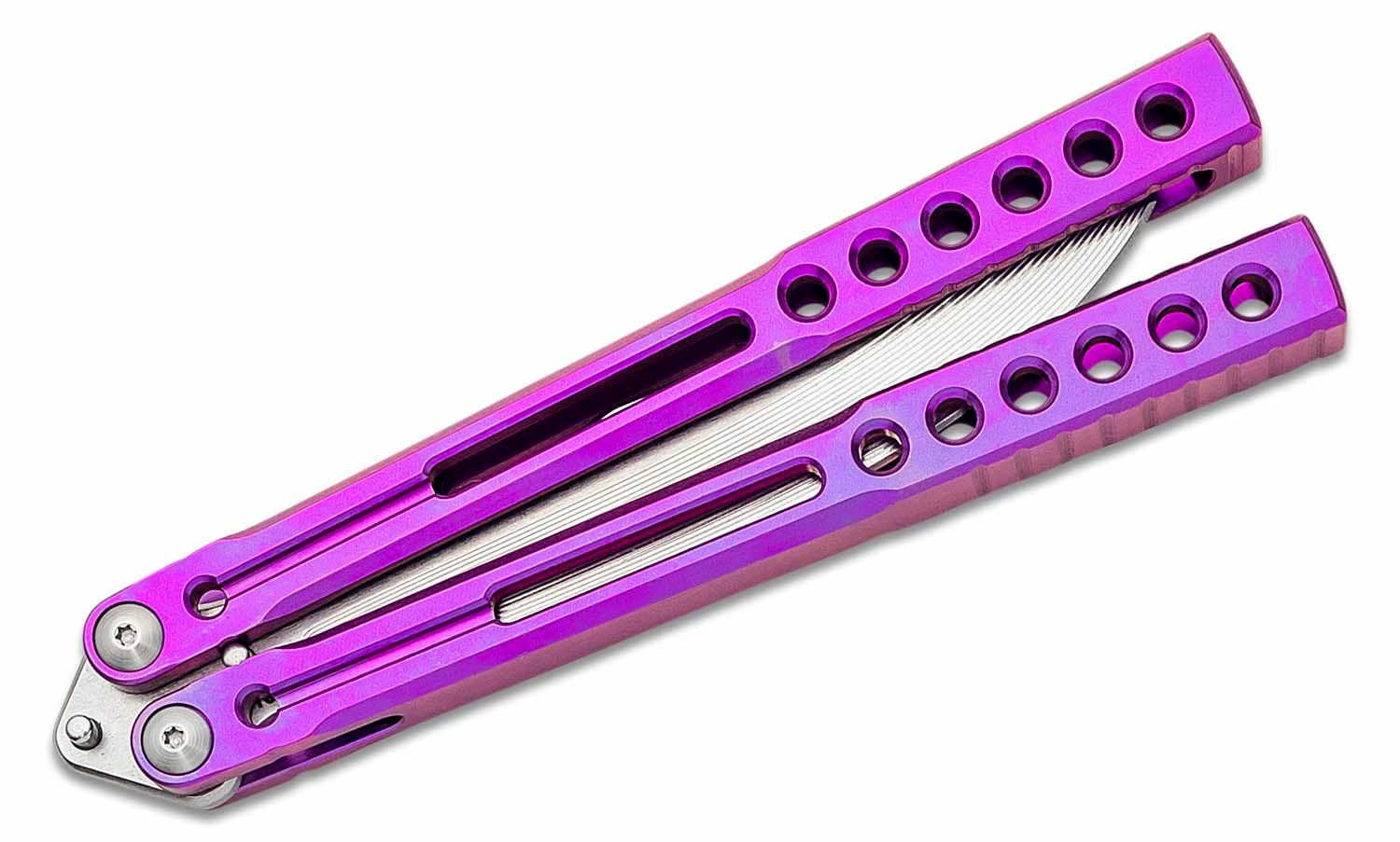 The Invictus balisong is the fourth “production” style knife offered by Heibel Knives. Invictus means “undefeated” or “unconquerable” The inspiration for the Invictus came from combining all of the good aspects of both its predecessor knives, the Sapient and the Menace, focusing on the flippability, comfort, and balance. Adam took the menace handles and slimmed them down to decrease the overall frame size, added and extended the jimping, and utilized side chamfers where the handle is gripped in order to give the handles a more rounded feel. He increased the washer thickness from 0.016″ to 0.020″ so that blade thickness and weight can be reduced. The blade tang was also redesigned to keep that extra material away so it doesn’t interfere with your fingers during flips. Also, the Invictus is being offered at a much lower price, who wouldn’t want that?