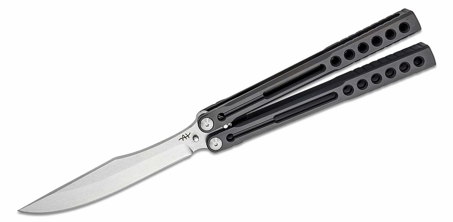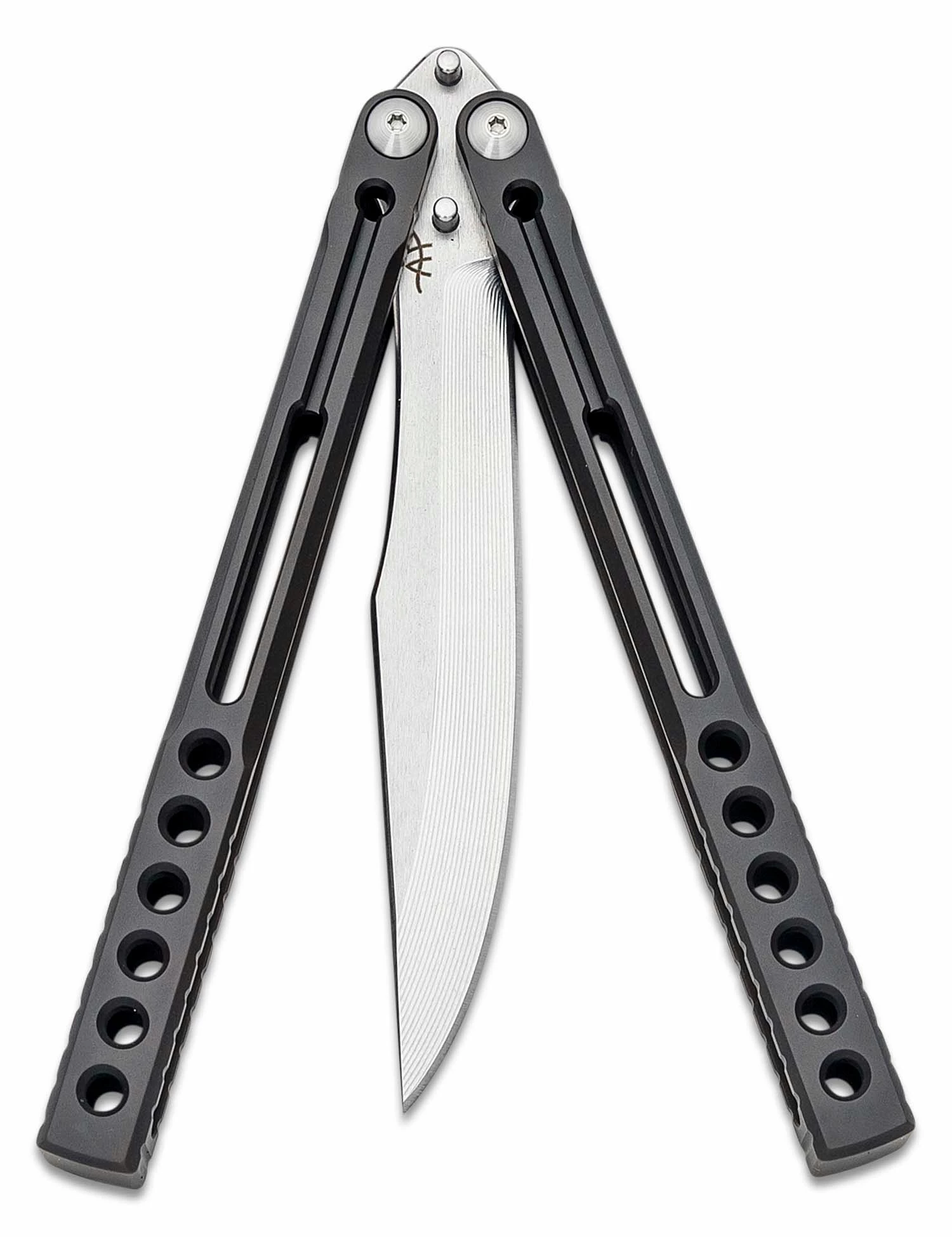 The Invictus balisong is the fourth “production” style knife offered by Heibel Knives. Invictus means “undefeated” or “unconquerable” The inspiration for the Invictus came from combining all of the good aspects of both its predecessor knives, the Sapient and the Menace, focusing on the flippability, comfort, and balance. Adam took the menace handles and slimmed them down to decrease the overall frame size, added and extended the jimping, and utilized side chamfers where the handle is gripped in order to give the handles a more rounded feel. He increased the washer thickness from 0.016″ to 0.020″ so that blade thickness and weight can be reduced. The blade tang was also redesigned to keep that extra material away so it doesn’t interfere with your fingers during flips. Also, the Invictus is being offered at a much lower price, who wouldn’t want that?