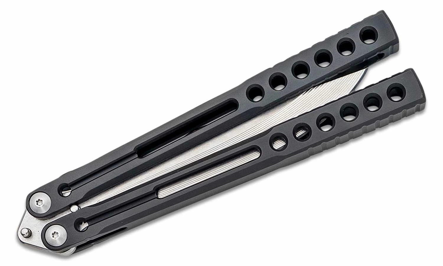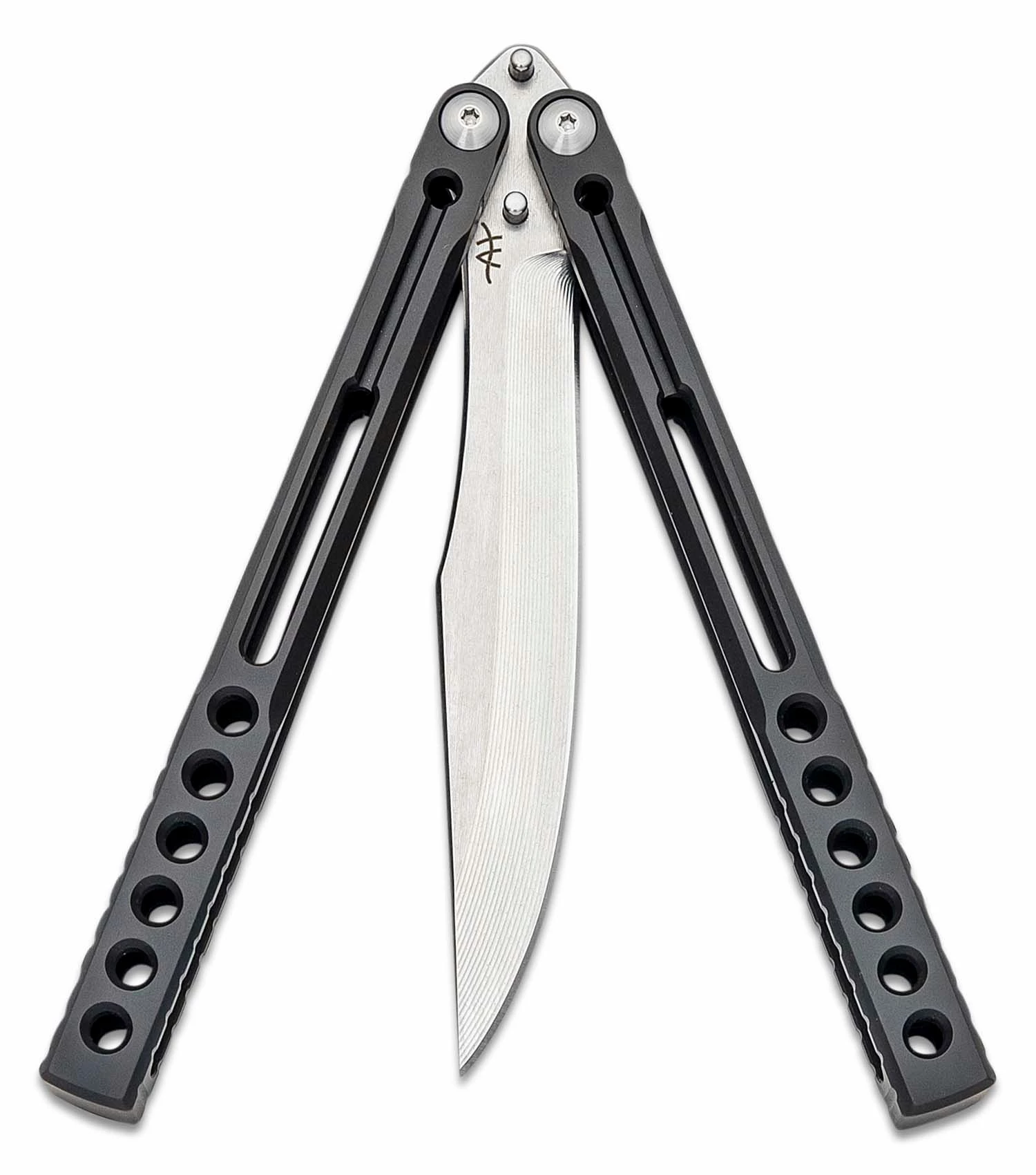 The Invictus balisong is the fourth “production” style knife offered by Heibel Knives. Invictus means “undefeated” or “unconquerable” The inspiration for the Invictus came from combining all of the good aspects of both its predecessor knives, the Sapient and the Menace, focusing on the flippability, comfort, and balance. Adam took the menace handles and slimmed them down to decrease the overall frame size, added and extended the jimping, and utilized side chamfers where the handle is gripped in order to give the handles a more rounded feel. He increased the washer thickness from 0.016″ to 0.020″ so that blade thickness and weight can be reduced. The blade tang was also redesigned to keep that extra material away so it doesn’t interfere with your fingers during flips. Also, the Invictus is being offered at a much lower price, who wouldn’t want that?