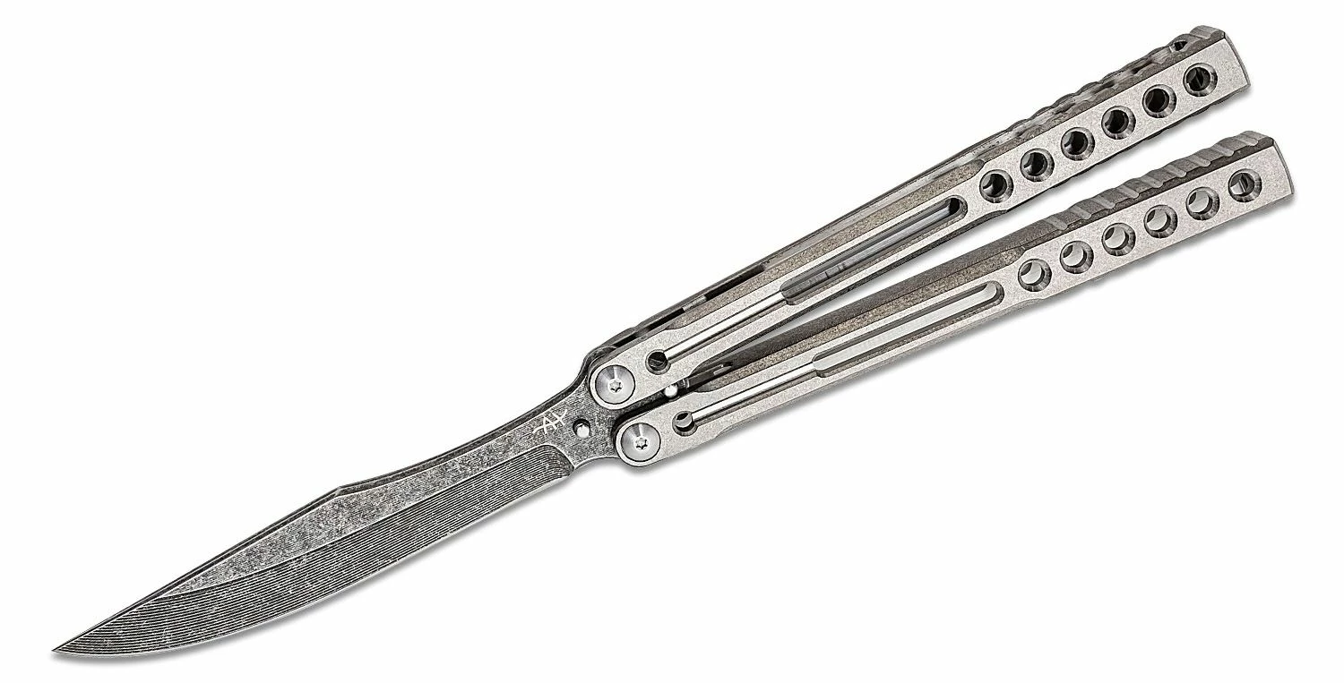 The Invictus balisong is the fourth “production” style knife offered by Heibel Knives. Invictus means “undefeated” or “unconquerable” The inspiration for the Invictus came from combining all of the good aspects of both its predecessor knives, the Sapient and the Menace, focusing on the flippability, comfort, and balance. Adam took the menace handles and slimmed them down to decrease the overall frame size, added and extended the jimping, and utilized side chamfers where the handle is gripped in order to give the handles a more rounded feel. He increased the washer thickness from 0.016″ to 0.020″ so that blade thickness and weight can be reduced. The blade tang was also redesigned to keep that extra material away so it doesn’t interfere with your fingers during flips. Also, the Invictus is being offered at a much lower price, who wouldn’t want that?