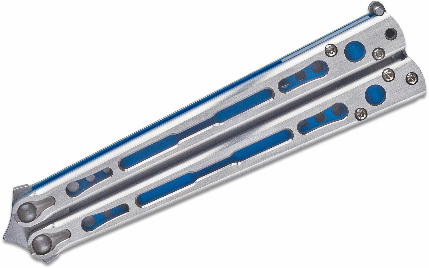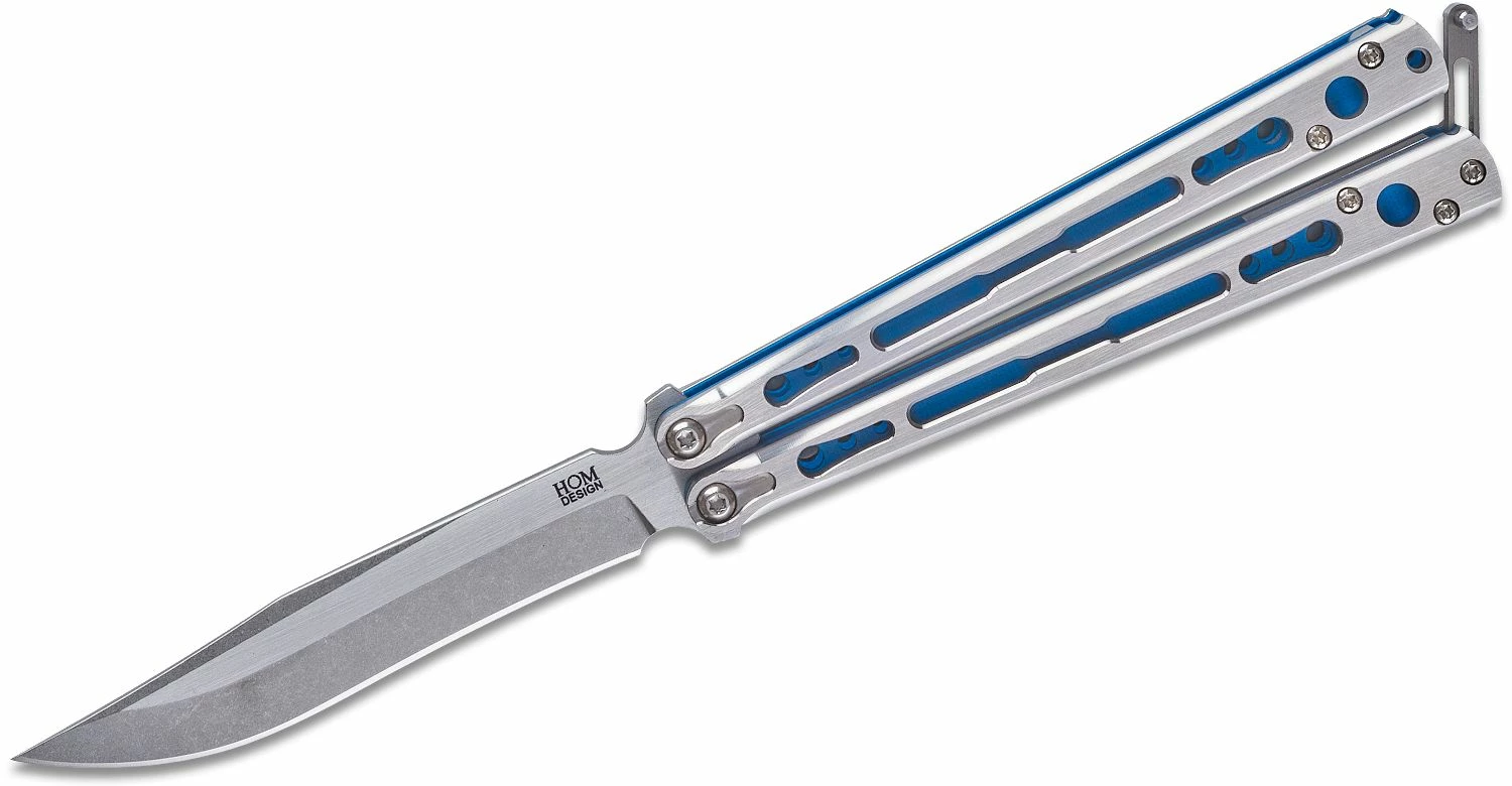 The Chimera Balisong is the latest creation from Hom Design. Packed full of cutting edge elements and premium features, the Chimera raises the bar in the production segment and is dual-purpose that is true to its name the knife excels at both a cutting tool and a performance flipper. Unique to this model, the overlays are titanium and provide a solid exterior structural design for the hidden zen pins that pass through the composite liners. The blade not only uses premium CPM-S35VN stainless steel with a crowned spine across all models but has a pinch-free spade tang that is inspired by the legendary Balibalistic Knives. The innovation culminates at the titanium pin latch, which can retract manually into the handle without any tools, springs, or magnets — a first in the balisong world.