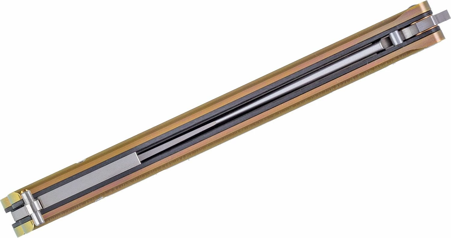 The Chimera Balisong is the latest creation from Hom Design. Packed full of cutting edge elements and premium features, the Chimera raises the bar in the production segment and is dual-purpose that is true to its name the knife excels at both a cutting tool and a performance flipper. Unique to this model, the overlays are titanium and provide a solid exterior structural design for the hidden zen pins that pass through the composite liners. The blade not only uses premium CPM-S35VN stainless steel with a crowned spine across all models but has a pinch-free spade tang that is inspired by the legendary Balibalistic Knives. The innovation culminates at the titanium pin latch, which can retract manually into the handle without any tools, springs, or magnets — a first in the balisong world.