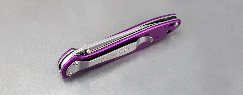 The handle is anodized aluminum; the same kind used in many aircraft and spacecraft applications. The purple color is a fade-resistant, scratch-resistant dye that’s permanently bonded to the aluminum. Looks good now, looks good later, too. For safety, a locking liner keeps the blade locked open during use and a Tip-Lock slider locks it closed when folded. The pocketclip is reversible for tip-up or tip-down carry and the handle is drilled to accept a lanyard.
