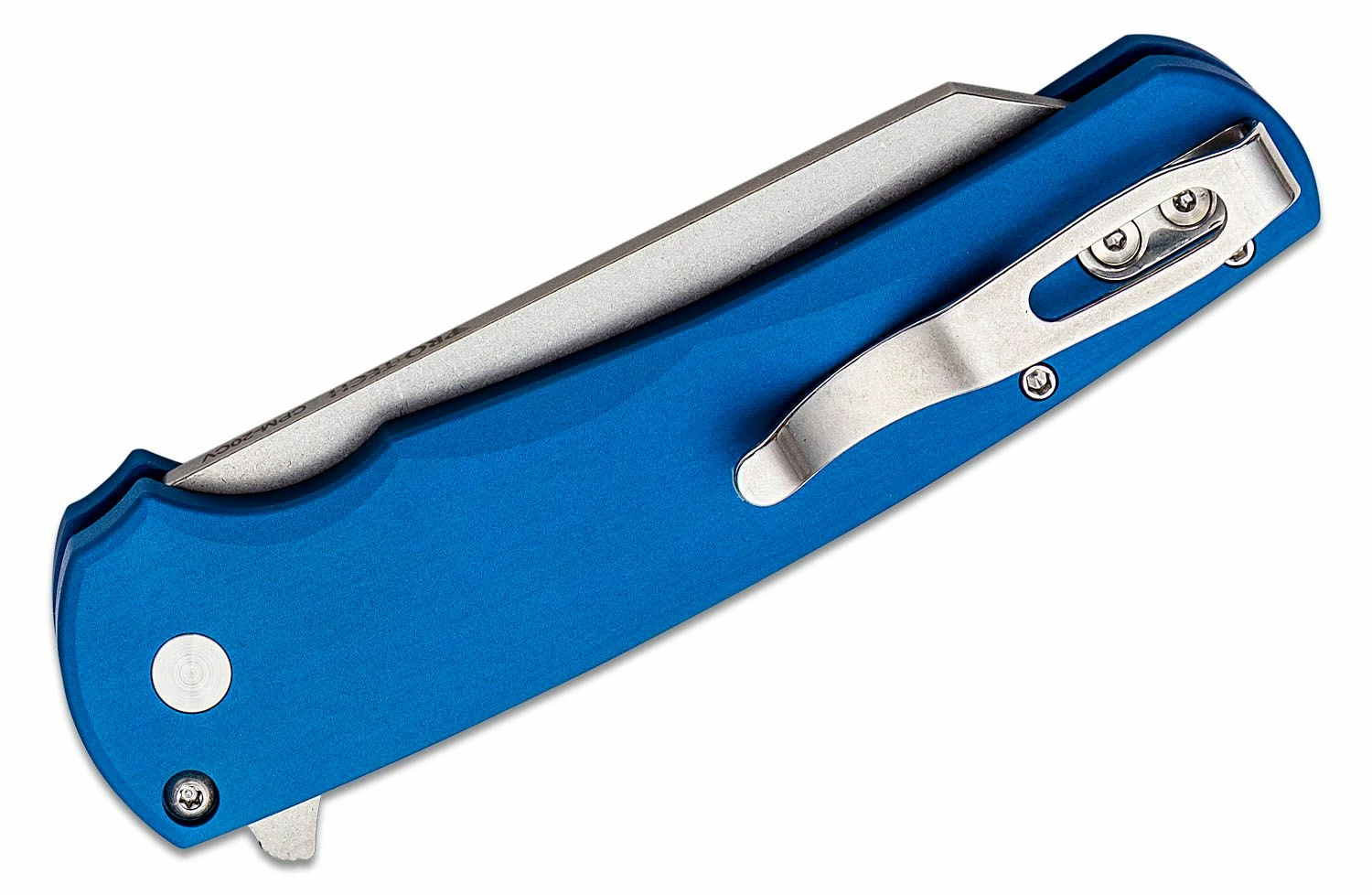 Highlighted by its silky smooth action and featherweight nature, the Malibu is an EDC force to be reckoned with. The reverse tanto blade is especially good at utility tasks with a slight belly and strong useful tip. The ergonomic handle is milled aluminum with a tapered shape and finger grooves that really allow for a solid, non-slip grip. The deep carry clip is set-up for right-hand, tip-up carry and a tiny lanyard hole is built into the single-pieces handle scales/backspacer. It reminds us a bit of a Kershaw Leek and a Benchmade 940…two of the best EDC knives available and we think it’ll find a home alongside those powerhouses in no time. This model features a stonewashed blade and blue aluminum scales.