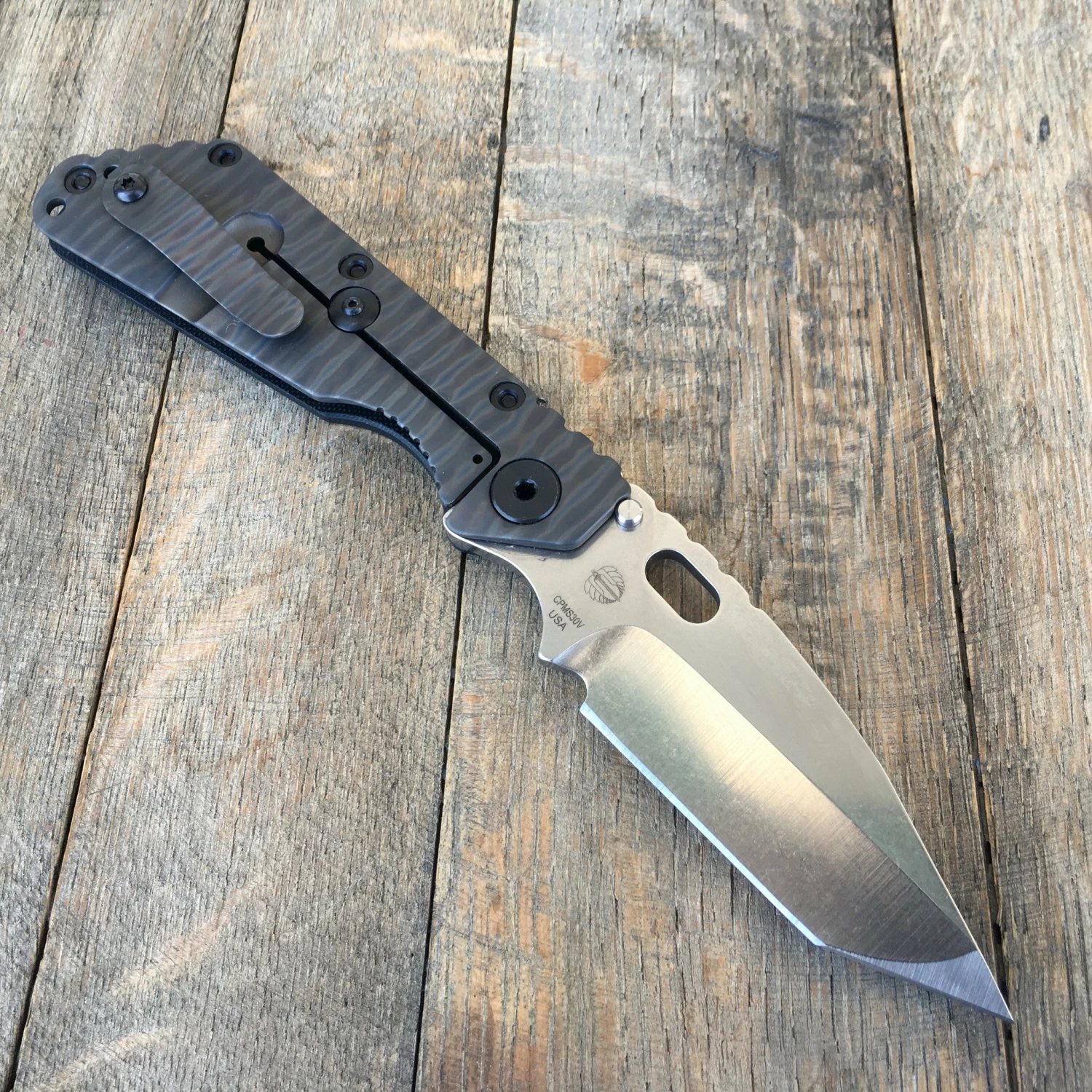 The SMF CC is a prime example of the quality and craftsmanship you can expect from Strider Knives. The CPM S30V Tanto blade is razor sharp with a stone wash finish. The front is marked “STRIDER” and the back has their logo. Includes dual heat treated stainless steel thumb studs and an oval thumb hole opener. The top of the knife features thumb ramp notching where the frame meets the blade spine for extra grip.