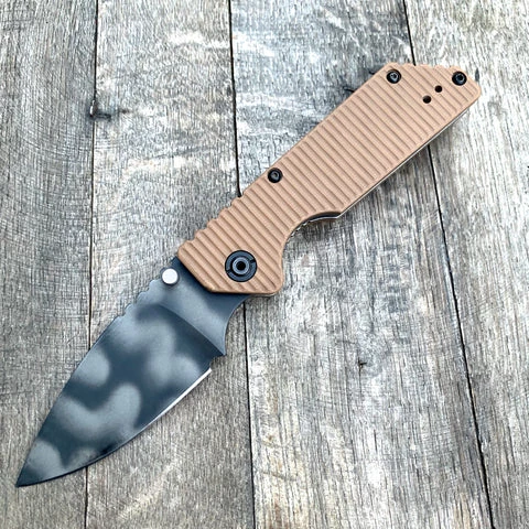 The SMF GG is a prime example of the quality and craftsmanship you can expect from Strider Knives. The S30V blade is 3/4 Ground Tanto edge. The front is marked “STRIDER” and the back has the logo. Includes dual heat treated stainless steel thumb studs and oval thumb hole opener. The top of the knife features thumb ramp notching where the frame meets the blade spine for extra grip.
