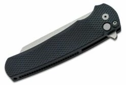 The SMF folder is a prime example of the quality and craftsmanship you can expect from Strider Knives. The blade is S30V stainless steel, flat ground with a stonewash finish. The front is marked “STRIDER” and the back has their logo. Includes dual heat treated stainless steel thumb studs and oval thumb hole opener. The top of the knife features thumb ramp notching where the frame meets the blade spine for extra grip.